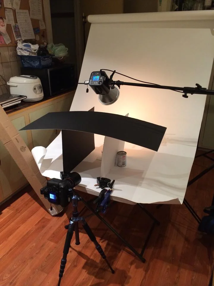 The trick with working with reflective materials is not to use direct light. Create light sources from refractive light. In the photo to the right I am using one strobe to light the background, the sides are black to give a black edge to the image and the "roof" is white to light the front of the glass.